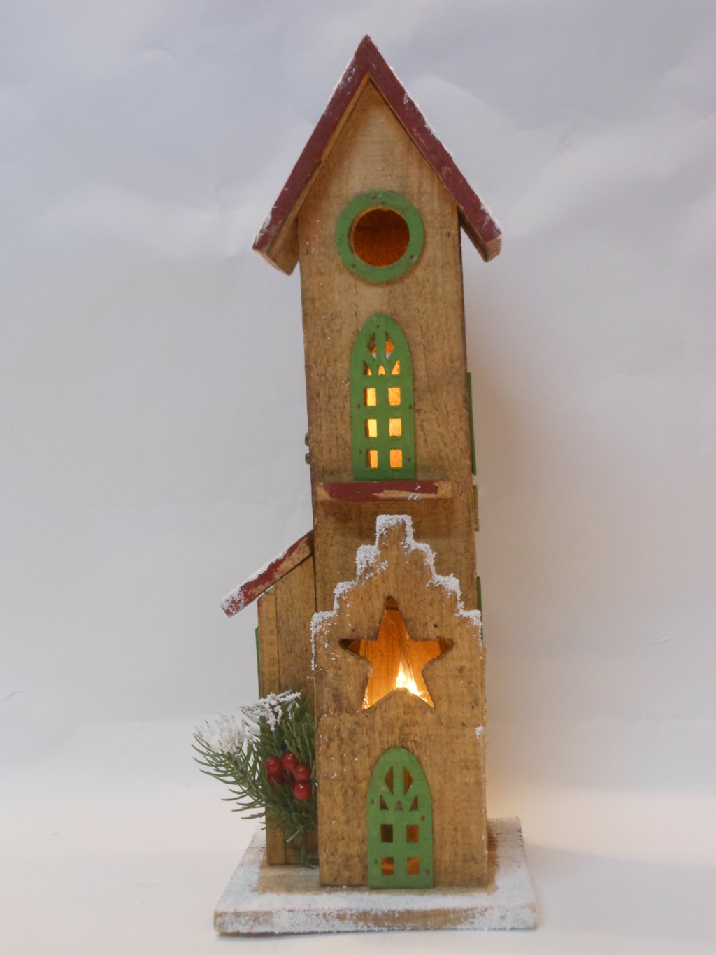 Graziosa chiesetta in legno illuminata con luci led a batteria. Riproduzioni delle chiese del nord Europa decorata a mano. (Disponibili anche altri modelli e altre dimensioni)