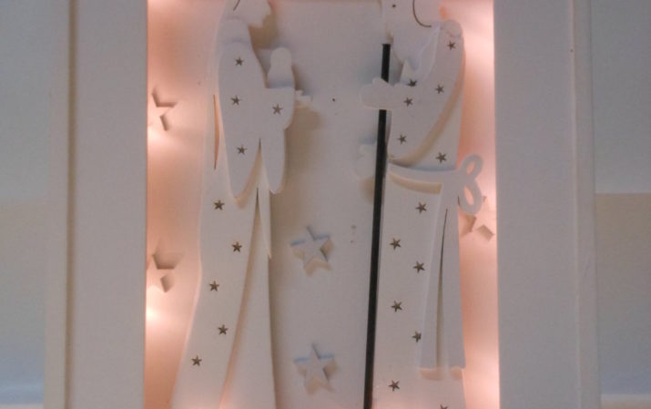 Pannelli in legno traforato a laser illuminati con lucine led, tramite batteria. Possibilità di appenderli a parete o appoggiarli su superfici come graziosi decori natalizi.