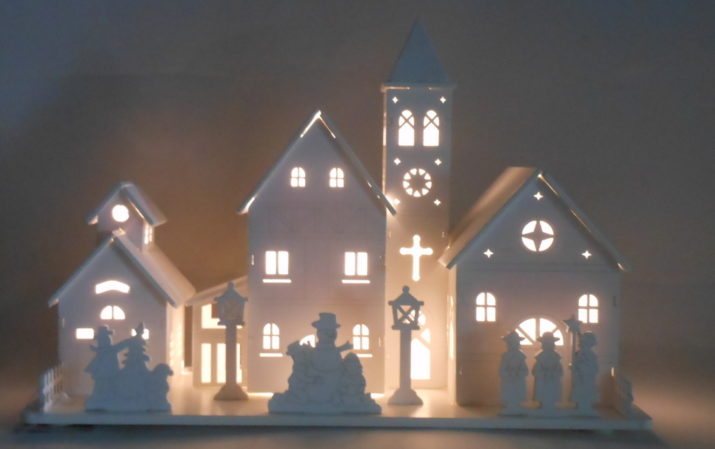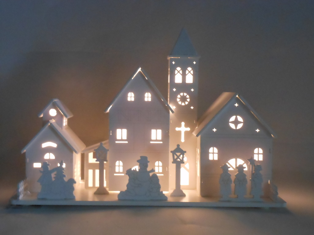 Il delizioso paesaggio natalizio in legno è tagliato a laser e illuminato con luci led a batteria. Curato nei più piccoli particolari ripropone i tradizionali avvenimenti delle allegre giornate festive e il bianco rende il tutto più pregiato ed elegante. (Disponibili anche altri modelli e altre dimensioni)